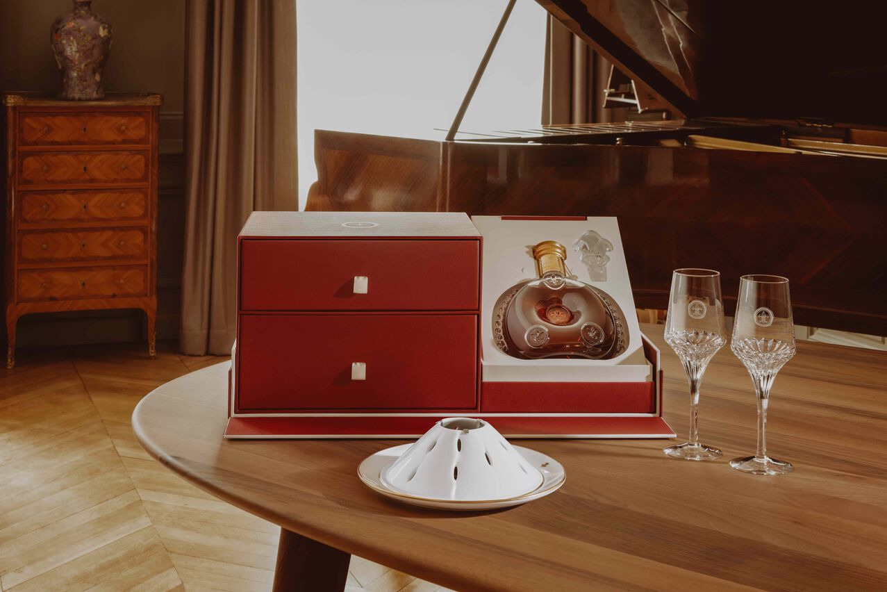路易十三《礼•尚》系列礼盒均秉持优雅的当代设计理念,采用路易十三经典红色,每一主题的奢华礼盒内部都划分为三个空间。最大的礼盒主室用于放置纯手工精制的路易十三经典装干邑,凝聚着历代酿酒大师的精湛技艺与悉心调配,用于调配的生命之水采用法国干邑地区中心地带大香槟区的优质葡萄进行酿造。此外还设有两个抽屉。上层抽屉装有两只路易十三限量版专属镌刻品鉴杯,由法国设计师克里斯多夫·皮耶 (Christophe Pillet) 专门设计。