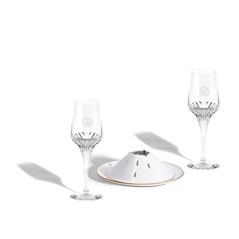 包含镌刻皇室百合花的昆庭 (Christofle) 镀银鱼子酱侍餐器皿,以及五只珍珠母贝鱼子酱专用匙。(即将推出)