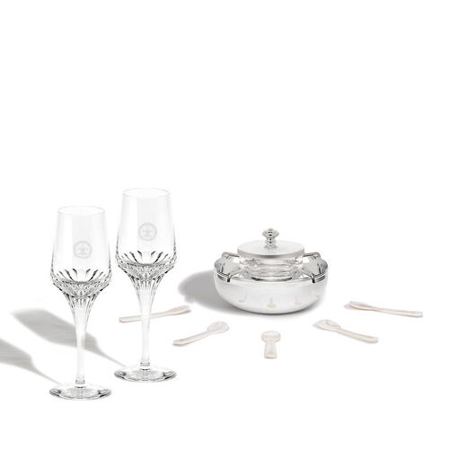 包含镌刻皇室百合花的昆庭 (Christofle) 镀银鱼子酱侍餐器皿,以及五只珍珠母贝鱼子酱专用匙。(即将推出)