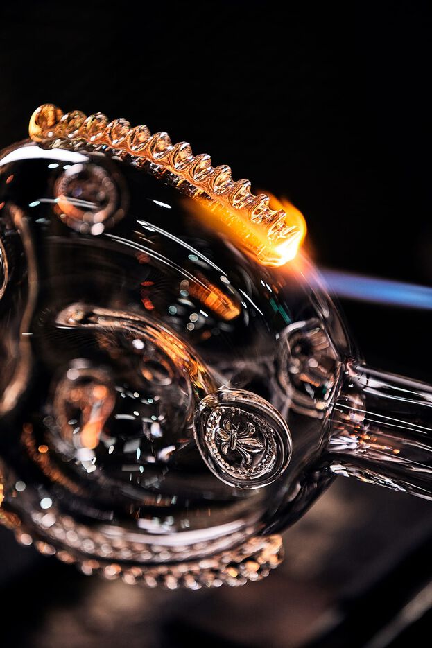 路易十三《时光典藏》之【光之城-1900】的酒樽经人工吹制而成,其特别之处在于,两侧各饰有 13 枚细齿凸纹,而非通常的 10 枚,瓶身则饰有 7 朵 18 克拉黄金皇室百合花纹饰。限量版酒樽瓶塞采用倒置酒樽造型,内置一枚近场通信 (NFC) 芯片,您可由此轻松注册您的酒樽,加入路易十三臻峯汇,获赠一枚来自巴黎铸币厂的特制奖章。