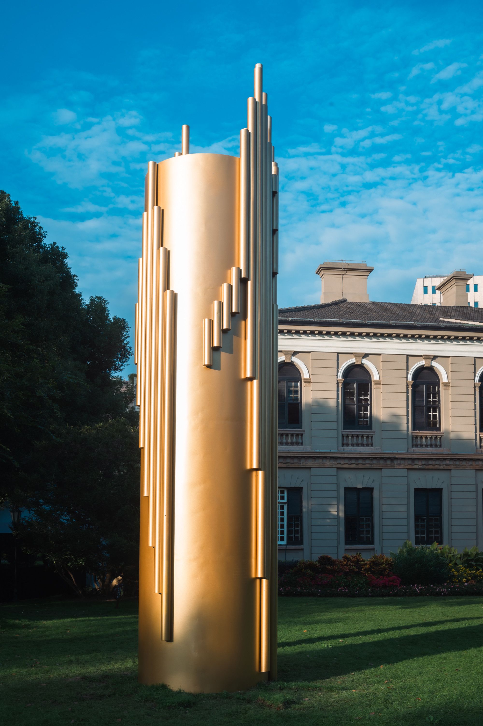 材质:空间音频声音装置、双频影像、黄铜管、黄钛不锈钢板、铝合金桁架